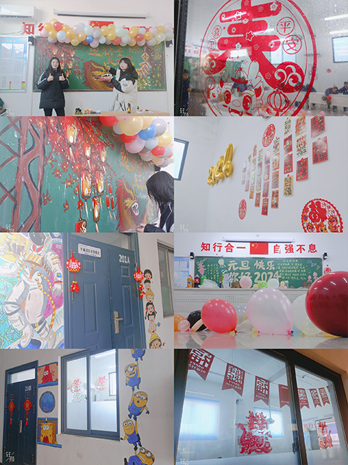 学校办公室和教育处在学校领导指导下,认真谋划,出台了详细的迎新实施方案。在班主任精心组织下,各班师生认真筹备。教室里挂满了五颜六色的气球和闪闪发光的彩带,黑板上“欢庆元旦”等醒目的大字、飘扬的气球、挥舞的彩带、喜悦的脸庞,营造了喜庆祥和的新年氛围。